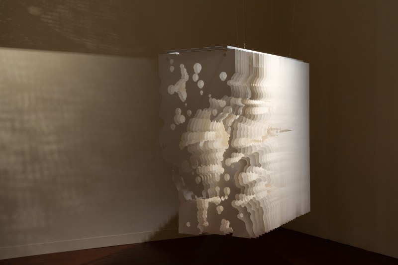 The artist’s scissors do not tremble though as they translate the upheavals of nature. There is a great deal of technical mastery and precision in the cutting behind these forms, which are almost deceptively simple. Snow-white, the paper used by the artist, called Yupo, is thick and water-resistant: it does not have the transparency of Washi, that very Japanese fine paper whose veins and fibers are so clearly visible, but it has a strength and lightness that allows for broken lines and layering. When illuminated by a light source, it takes on a warm, soft, and enigmatic presence. Presented in the cold, harsh light of day, it forms a block or blends into the walls and pedestals—a true wall-walker.